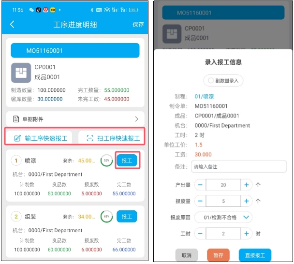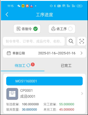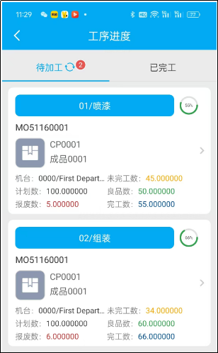 一、要點介紹工序進度單能夠實時記錄各道工序的完成情況,使管理者能夠迅速了解當前的生產進度。有助于及時發(fā)現生產中的瓶頸和問題,從而采取相應措施進行調整和優(yōu)化。 二、新功能亮點1實時掌握生產進度:工序進度單能夠實時記錄各道工序的完成情況,使管理者能夠迅速了解當前的生產進度。 2.2優(yōu)化生產流程:通過對工序進度單的分析,可以發(fā)現生產流程中的不合理之處,如工序銜接不暢、工時分配不均等。 三、功能說明3.1工序進度可按制令單或工序來展示 舉例:制令單:MO51160001,制造數量100個,有兩道工序; 工序1報工50,報廢數量5個; 工序2報工60個;報廢數量6個; 成品繳庫30個。 依制令單展示:列示制造數量、制成品完工數量,繳庫數量以及未完工數量 依工序展示:按工序列示計劃數量、制成品完工數量,未完工數量、良品數以及報廢數;并且每道工序會展示完工百分比。 3.2、通過工序進度單進行報工 在工序明細界面,可以通過掃工序或者點擊報工按鈕進行報工。錄入報工信息后會自動計算出工資。 |