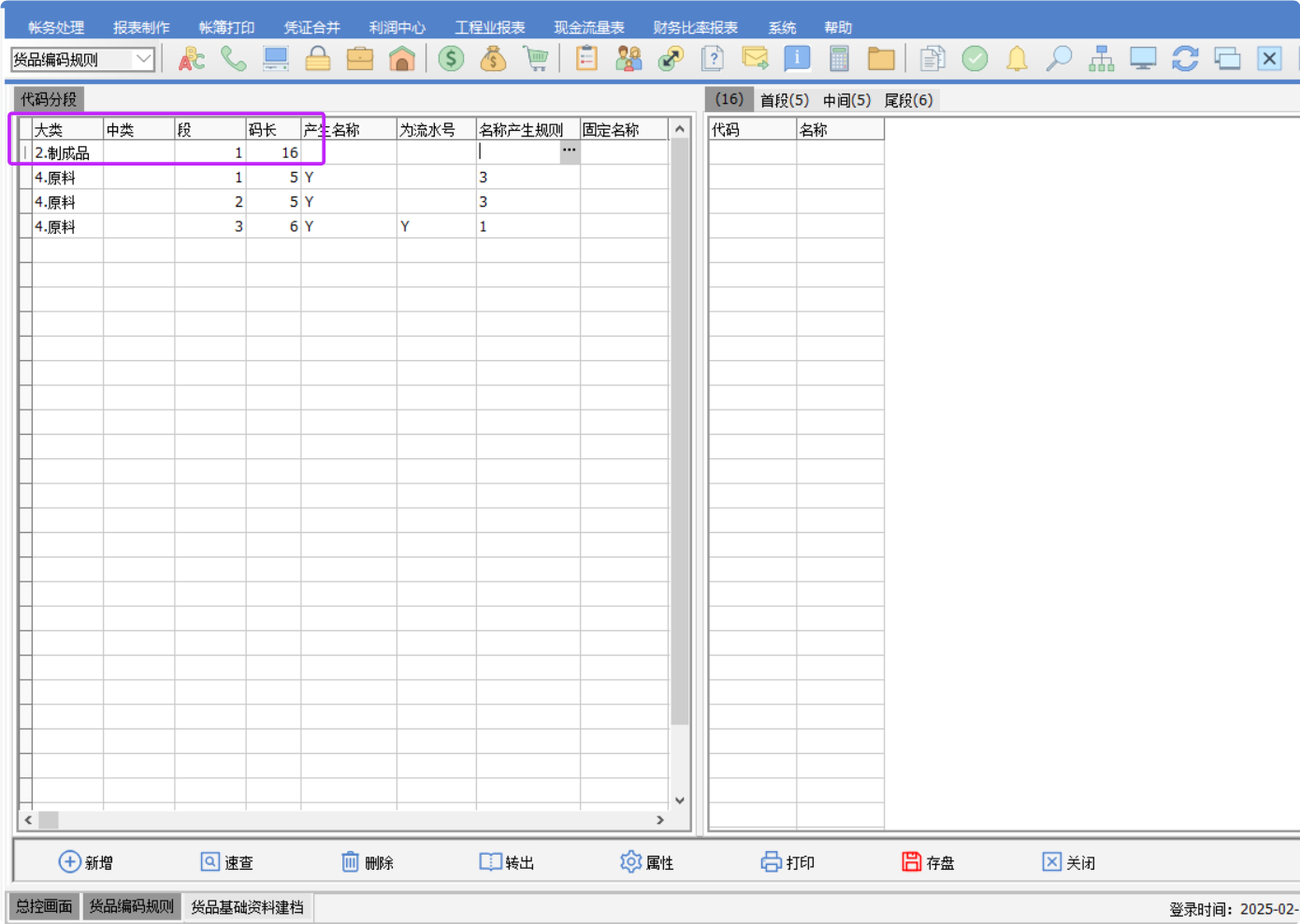 貨品資料建檔中,希望新增貨品時,貨品代號錄入的內容要達到或者超過某位長度才允許存盤,否則不允許存盤 1.首先進行貨品編碼規則設置,如大類制成品控制碼長16位,選擇大類,輸入碼長 2.貨品資料建檔屬性設置,《品號長度與分段規則總碼長度不等--不允許存盤》 3.當存盤貨品時則會彈出提示:貨品長度(4)與分段規則總碼長(16)不一致! |