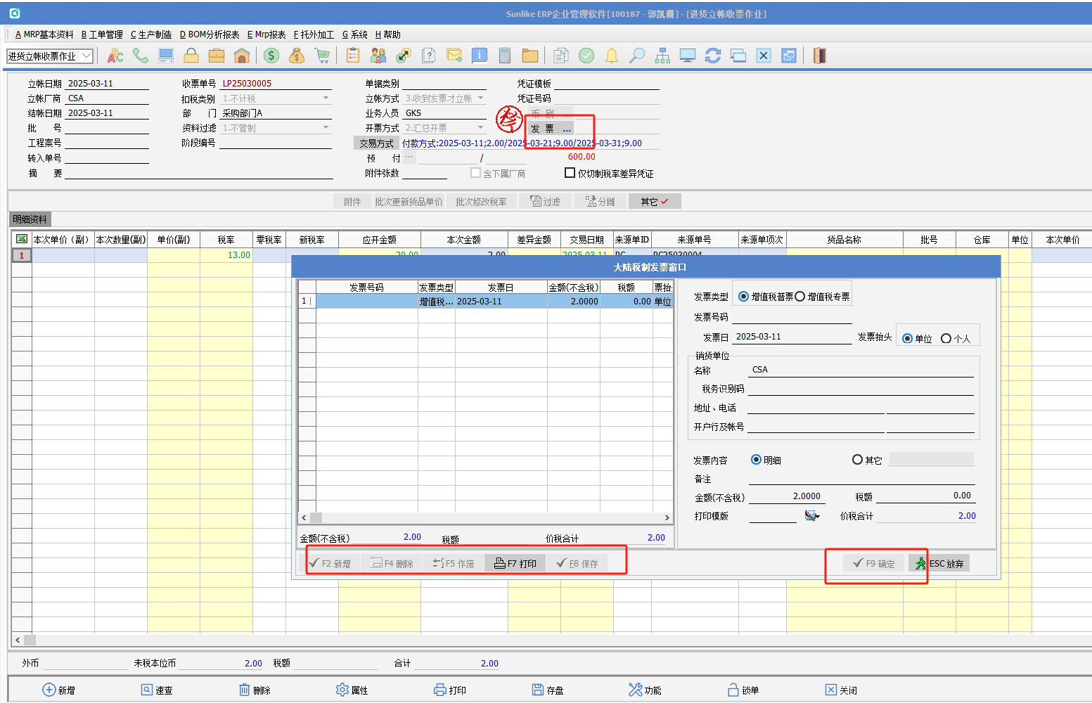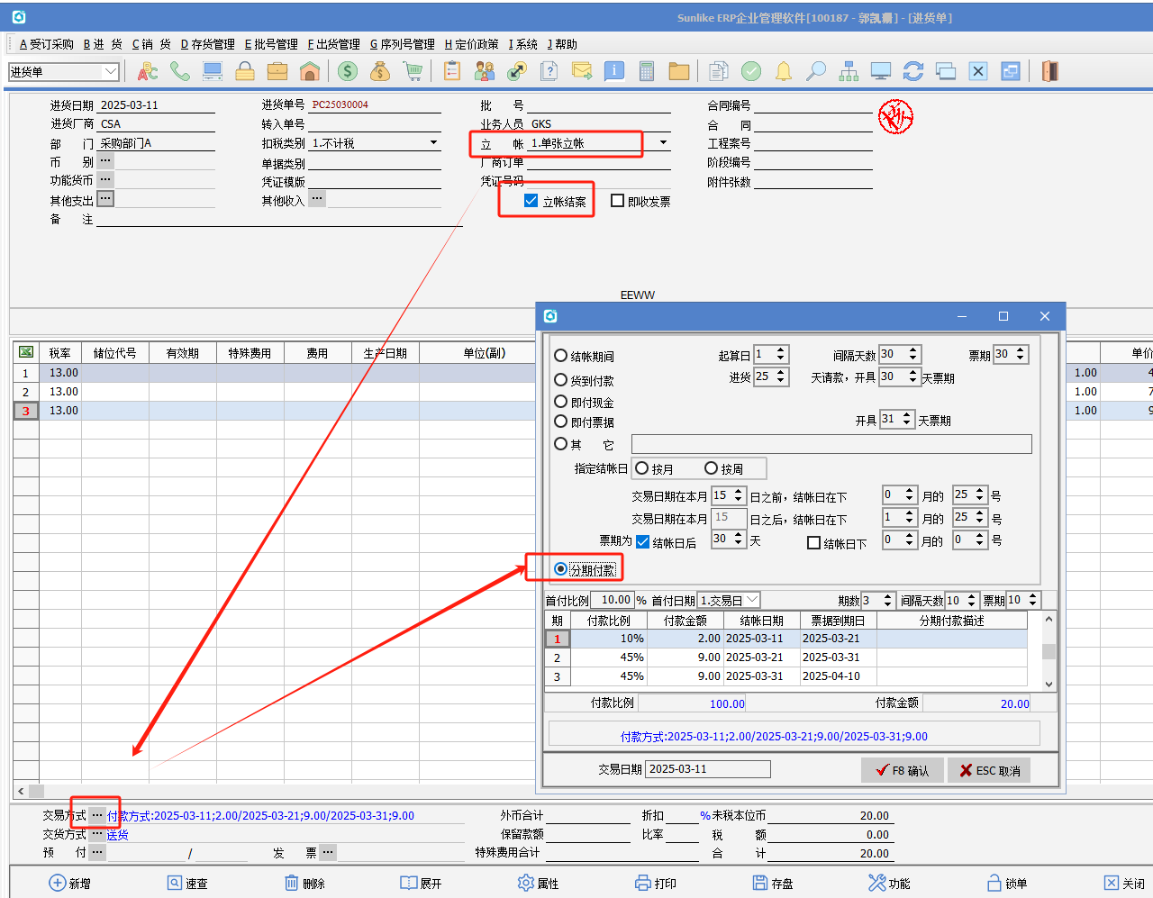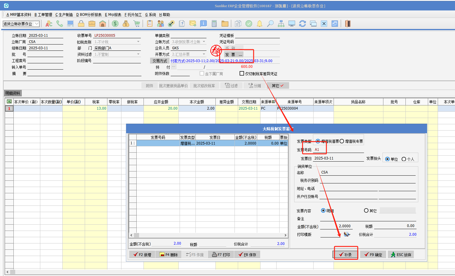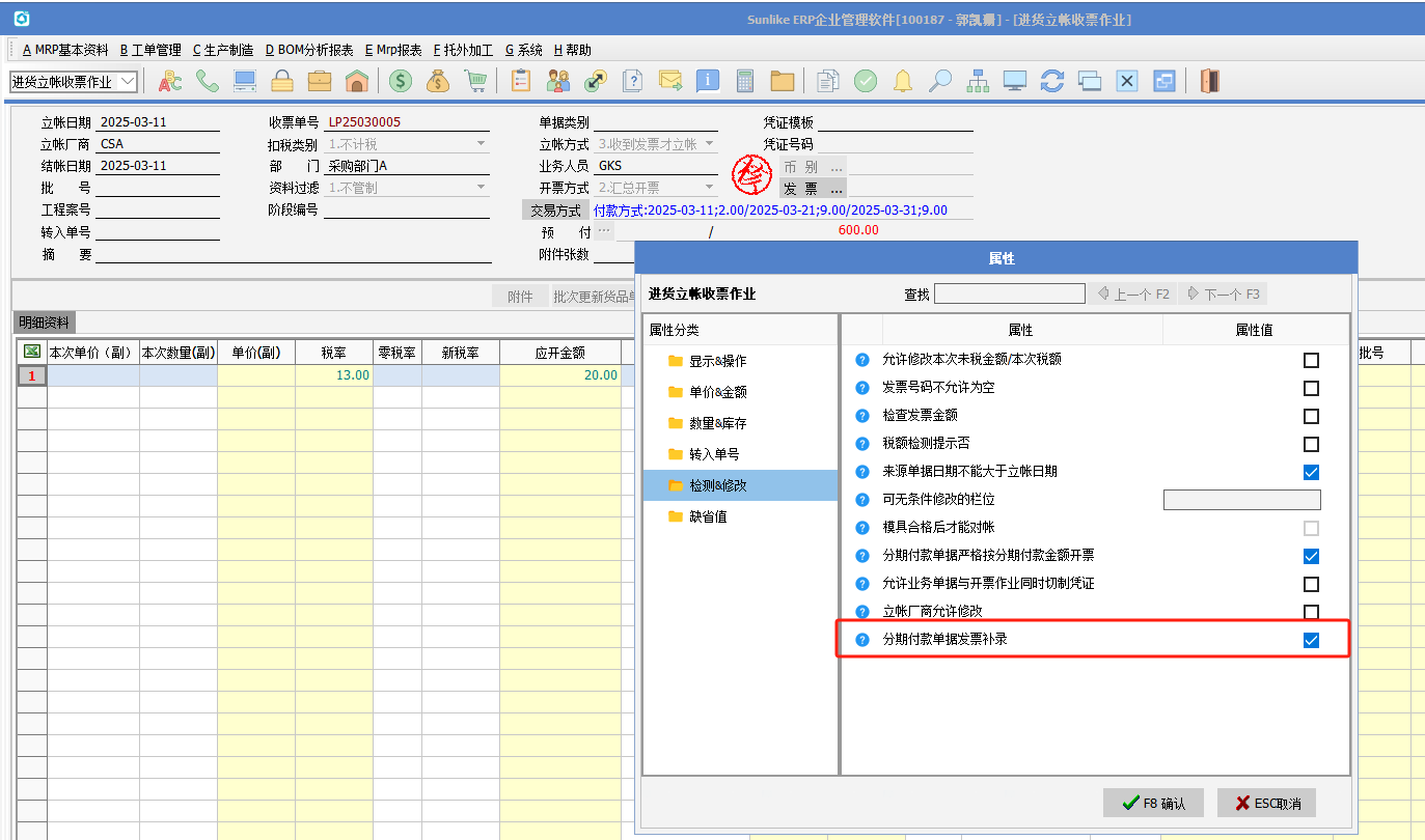 1.需求: 分期收付款的進貨單跟銷貨單表頭立賬方式都是是單張立賬,系統(tǒng)會自動產(chǎn)生多張進貨立賬收票作業(yè)跟銷貨立賬開票作業(yè),但是客戶是先立賬后補發(fā)票的,并且可能存在多個發(fā)票號碼的情況,故進貨立賬收票作業(yè)、銷貨立賬開票作業(yè)增加屬性“分期付款單據(jù)發(fā)票補錄”。 2.屬性:“分期付款單據(jù)發(fā)票補錄”說明 1.不勾選:系統(tǒng)無法錄入發(fā)票號碼; 2.勾選:當進貨立賬收票是由分期付款方式產(chǎn)生的,大陸制發(fā)票視窗(INV_No_DLS):增加“補錄”按鈕。通過該按鈕,可以將視窗中的發(fā)票記錄保存至發(fā)票庫。 具體處理如下:點擊該按按鈕時,程序?qū)⒏鶕?jù)發(fā)票視窗的結(jié)果進行以下回寫處理: 補錄檢測:管控視窗中所有記錄的“價稅合計”合計值必須小于等于單據(jù)的“金額”合計值。 補錄檢測通過后,執(zhí)行以下處理: 當單據(jù)表頭庫[MF_LZ1].inv_no為空時:將發(fā)票視窗第一筆記錄的“發(fā)票號碼”回寫至該字段。 將發(fā)票視窗的記錄保存至發(fā)票數(shù)據(jù)庫[INV_NO]。 將發(fā)票視窗的“發(fā)票號碼”按單據(jù)別+單據(jù)號碼保存至進貨立賬開票作業(yè)發(fā)票數(shù)據(jù)庫[MF_LZ1_INVNO]。 3.操作說明(以進貨單為例,銷貨單同理可參考): (1)進貨單設(shè)置分期付款 (2)進貨立賬收票作業(yè)未勾選屬性“分期付款單據(jù)發(fā)票補錄”,分期付款產(chǎn)生的立賬收票作業(yè)無法錄入發(fā)票號碼 (3)進貨立賬收票作業(yè)勾選屬性“分期付款單據(jù)發(fā)票補錄” |