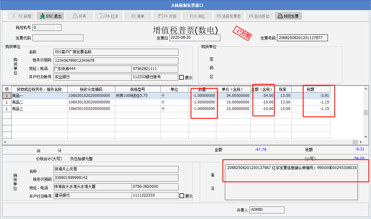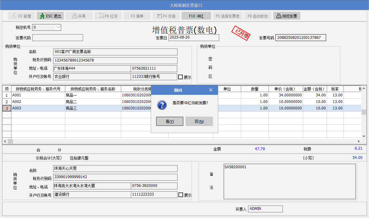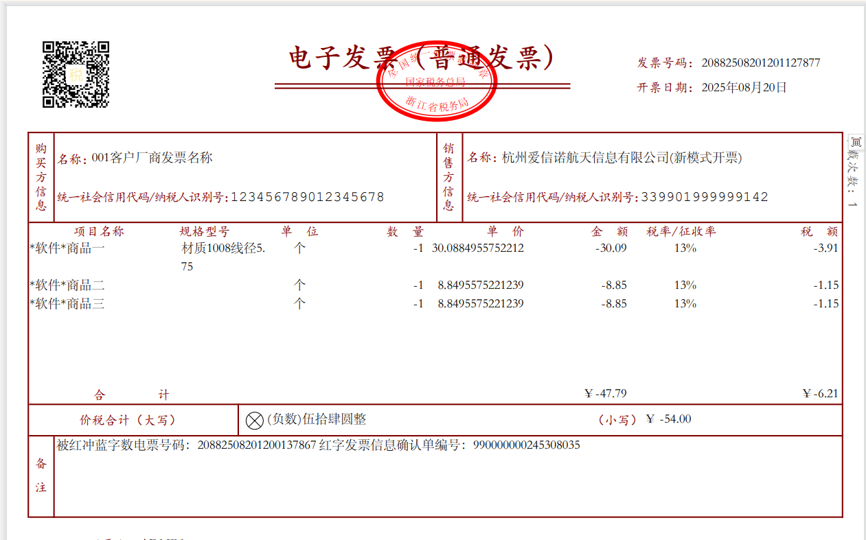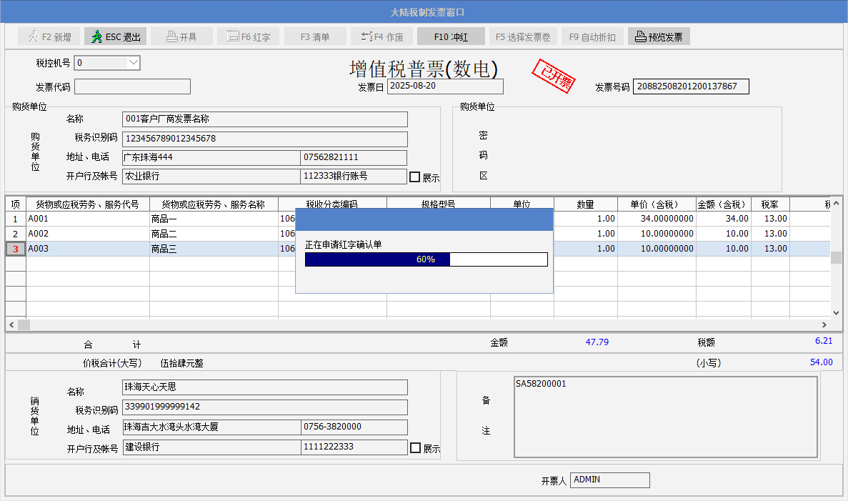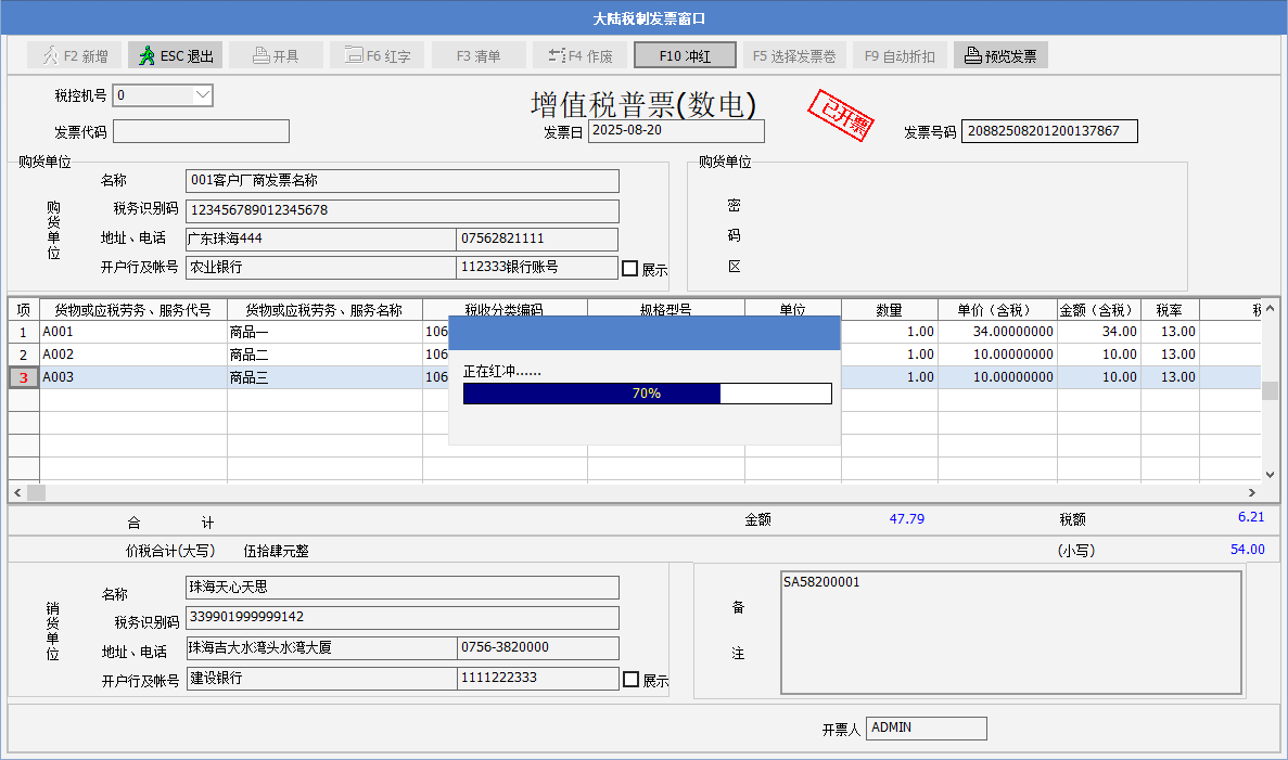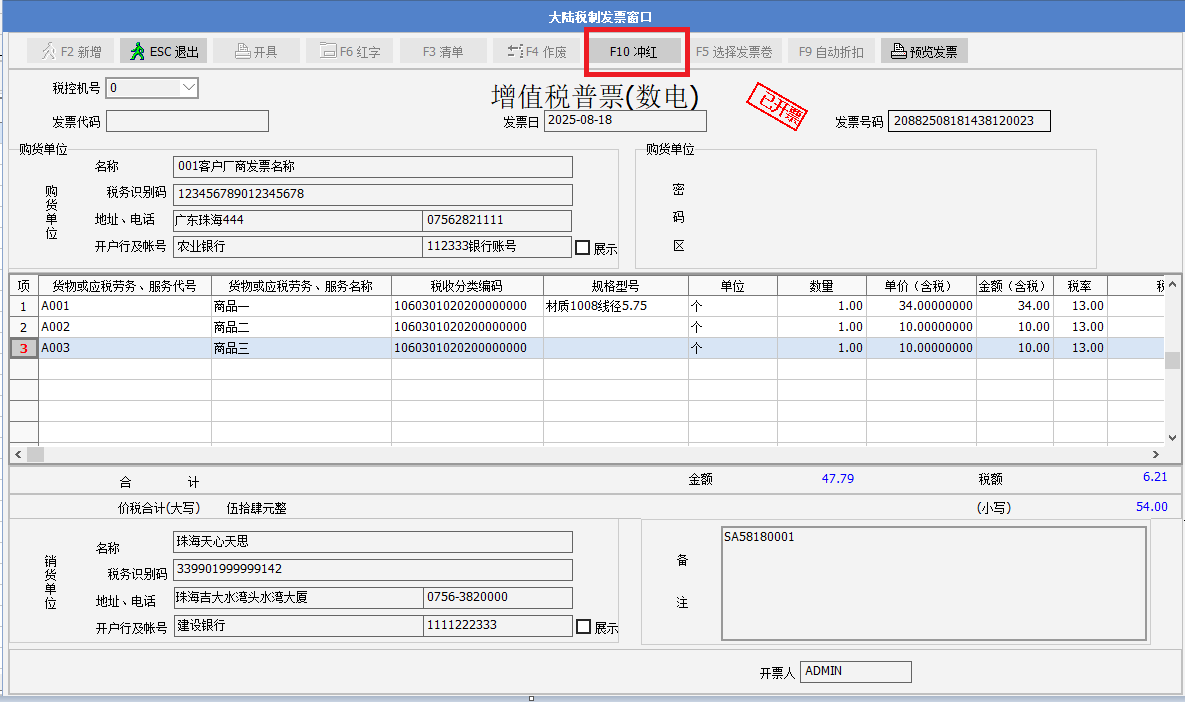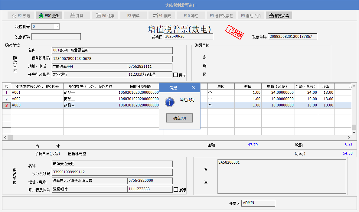 一、要點介紹銷售方開出數電發票,在客戶沒有確認前,若發現開出的數電發票開錯了,以前是需要開票人員到稅控開票系統做沖紅,現在可以在sunlike里做沖紅操作。實現的效果:如銷貨單開出A數電發票,沖紅后,可以重新修改單據數據再次開B發票。Sunlike請升級到2025年8月21號或之后的365A版。 二、正文內容************* 1. Sunlike 在增值稅數電開票界面,增加沖紅的按鈕。 2. 舉例說明:銷貨單開出了增值稅發票后,需要做沖紅,點發票窗口的F10沖紅按鈕,彈出提示“是否要沖紅當前發票?” 3. 沖紅過程: 4. 彈出提示“沖紅成功”,點確定。Sunlike通過諾諾網接口獲取到沖紅發票號碼,備注中列示--紅字發票信息確認單編號,表身的數量以及金額欄位顯示為負數。 5. 紅沖發票可以預覽,界面如下: 6. 單據的發票紅沖后,可以修改單據,繼續開出新的數電發票。 |