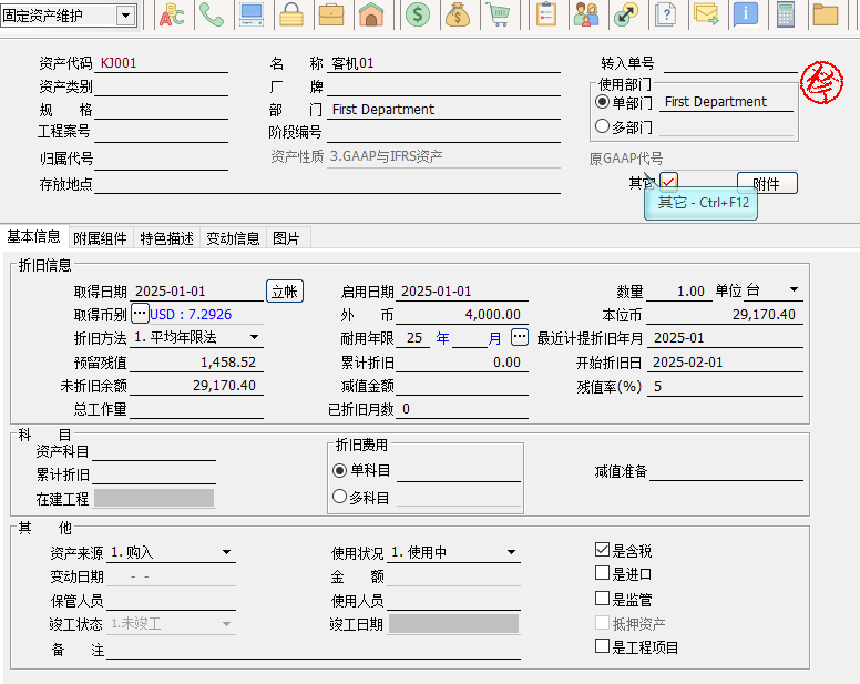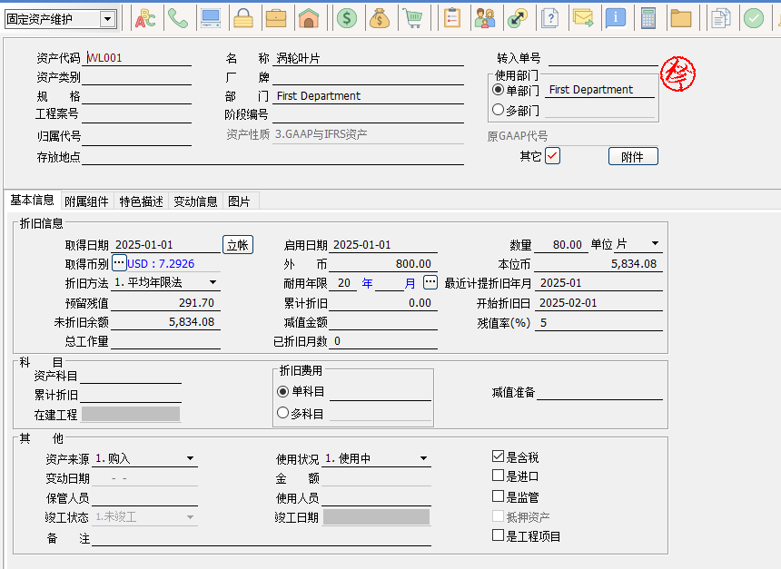 需求:企業的大型固定資產進行功能改良過程,會購入新的配件(配件的性質也是固定資產價值高),該配件按常規的固定資產進行日常折讓、報廢、減值、停用、改變歸屬資產處理。希望但在報表(財產目錄、折舊提列統計表、固定資產折舊情況表)可以選擇查看大型固定資產的總價值。 用戶是走固定資產采購流程,采購入庫后產生新的固定資產。用固定資產變動將配件與主資產進行綁定,各種報表查詢按需查詢即可。以下以客機和渦輪葉片為例: 新增完畢后,在固定資產變動中過濾出配件部分選擇改良-其它,將配件歸屬代號選擇主固定資產即可 報表財產目錄、折舊提列統計表、固定資產折舊情況表都增加的條件資產列示含所屬來包含配件的金額。 |